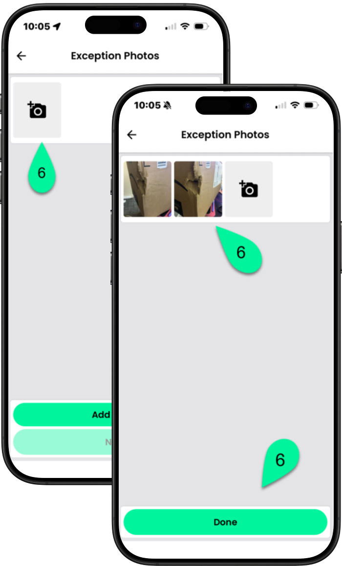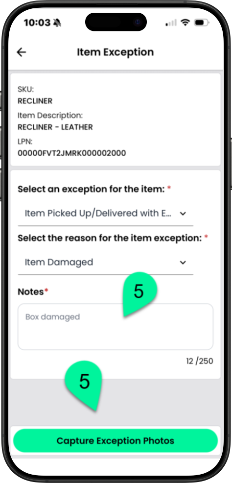 Write a description of what the damage is, then tap Capture Exception Photos.