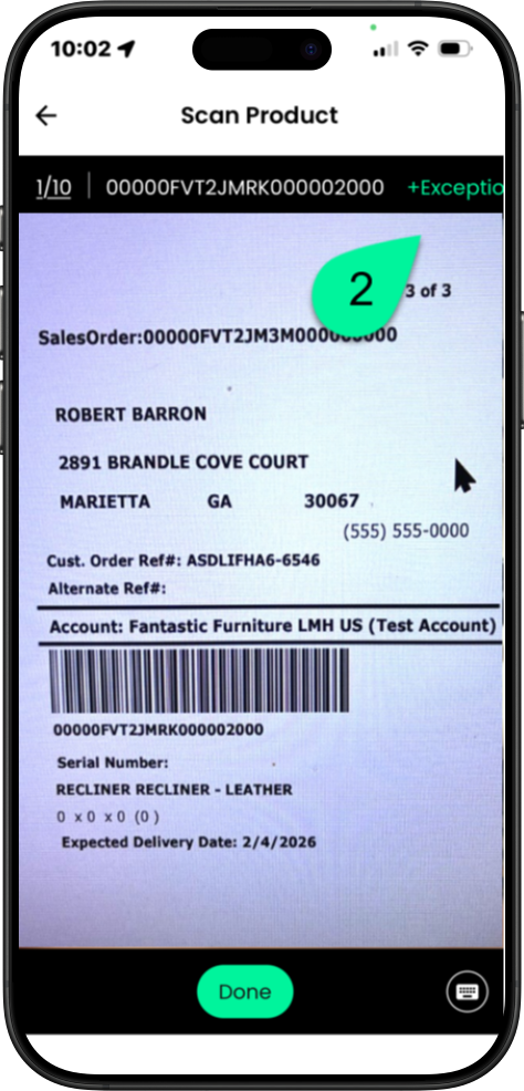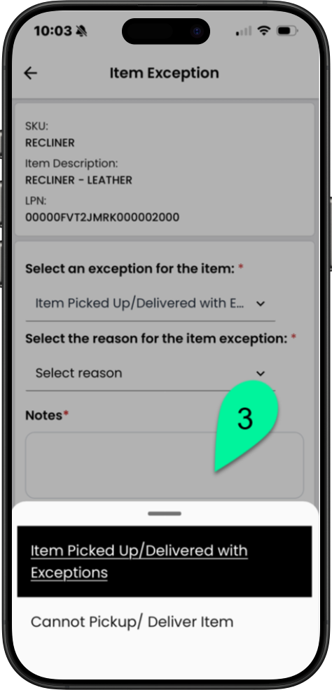 Begin scanning your freight. When you locate the one with damage, scan it first then tap +Exception