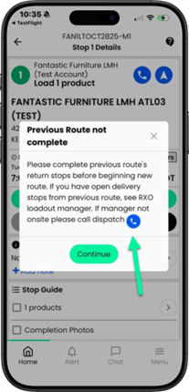 2. In cases where no manager is available on-site to process returns, the SPE can contact the dispatcher directly by tapping the phone icon within the app.